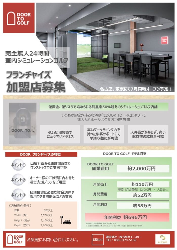 DOOR TO GOLF フランチャイズ加盟店の募集を開始いたしました。内容をご確認の上ご興味・ご検討の方はお問い合わせください。物件相談からプランニングまで検討初期からご相談を承ります。